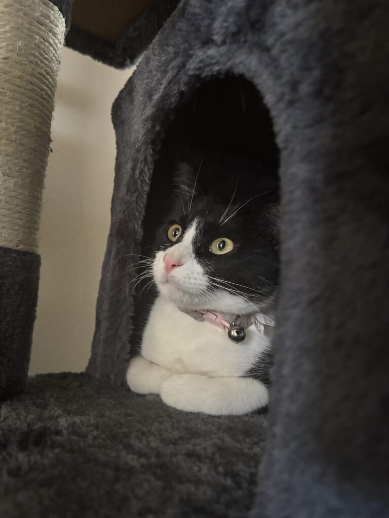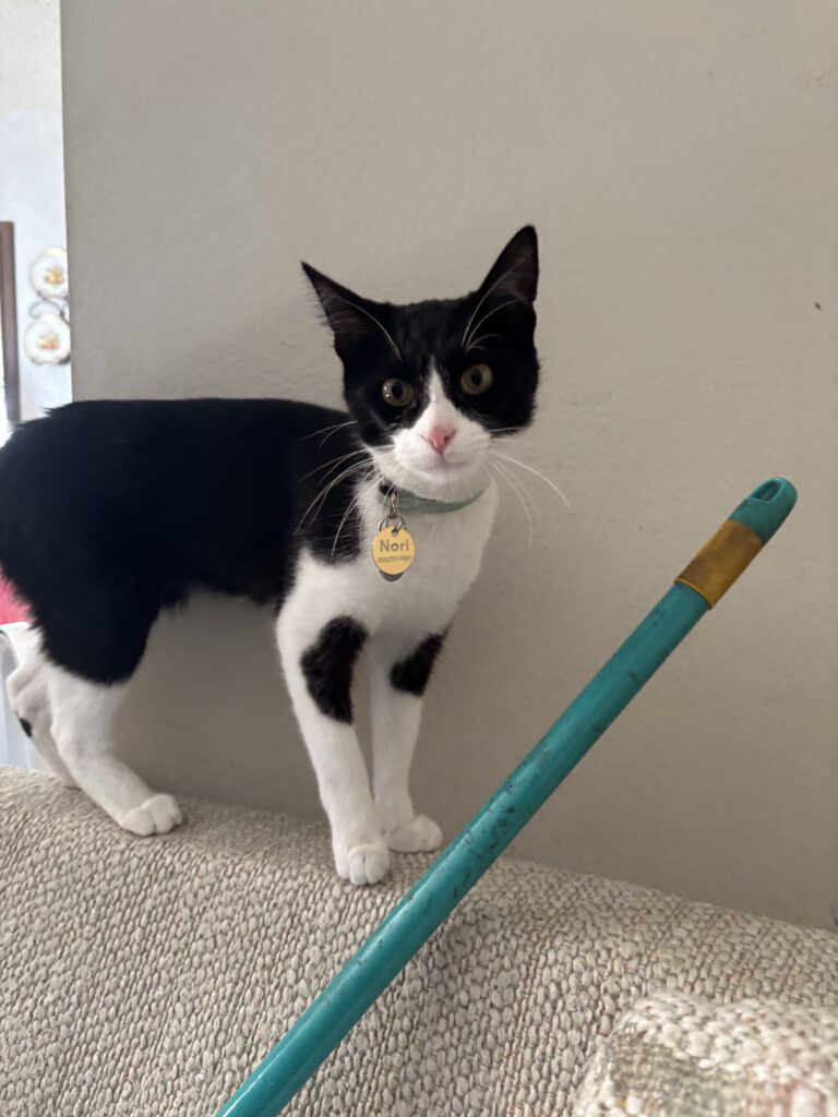 Nori has been missing for a week now. She is a 10 month old black and white tuxedo. The white pattern on her face comes to a sharp point on her nose bridge. Last seen with her green breakaway collar. She knows her name but is scared easily. She likes kitten sounds and churu treats.