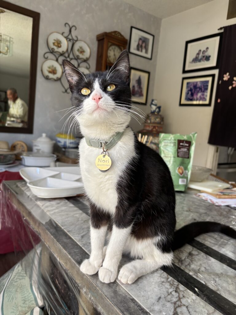 - Other Distinguishing Features or Notes: Nori has been missing for a week now. She is a 10 month old black and white tuxedo. The white pattern on her face comes to a sharp point on her nose bridge. Last seen with her green breakaway collar. She knows her name but is scared easily. She likes kitten sounds and churu treats.