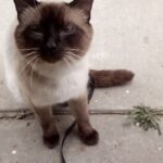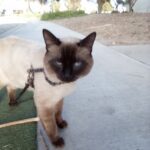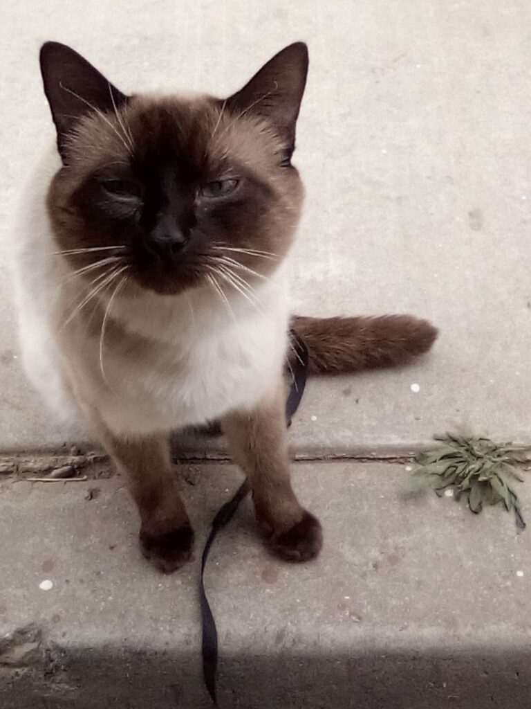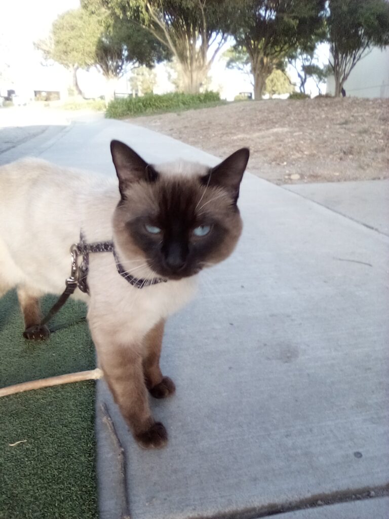 Seal point Siamese intact mail. Meaning he is not neutered and you can definitely tell. He wears a skull and crossbones harness, and likes very much to go out at night, he is not a big fan of the day. He’s like a vampire he only goes out at night! I walk him multiple times a day on his leash so he knows to stay close because loud noises and large dogs frighten him, he is never run off anywhere ever before so this is very upsetting.